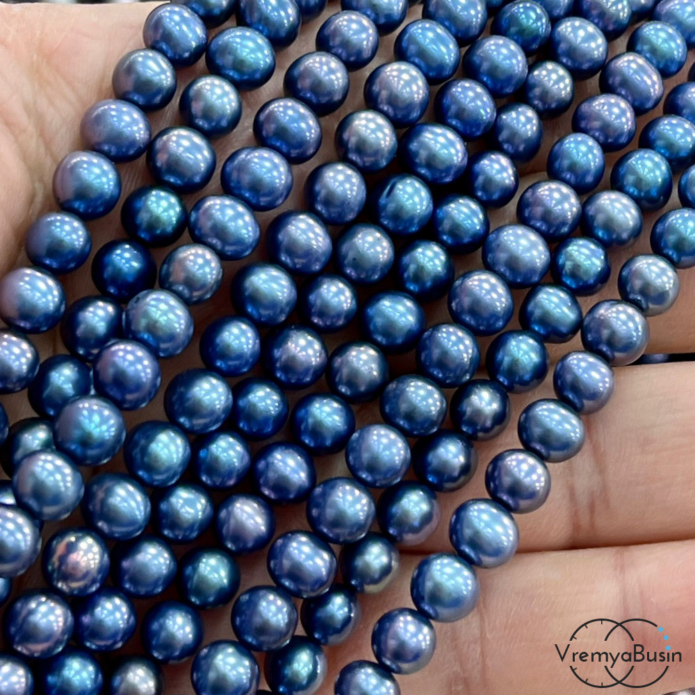 Жемчуг натуральный речной, округлый 6 мм, цв. синий (нить, ок. 40 см.)