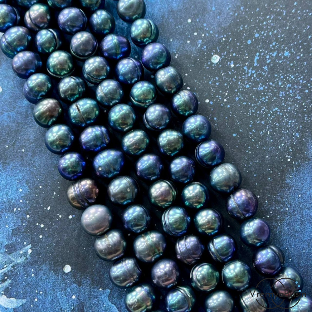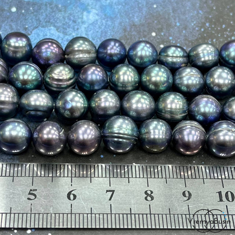 Жемчуг натуральный речной, округлый ок. 10 мм, цв. сине-черный (нить, ок. 38 шт.)