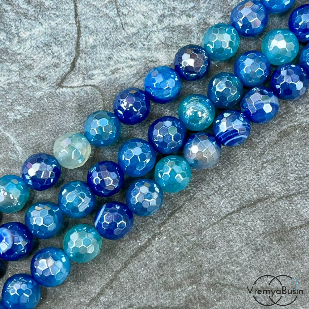 Агат тонир., шарик граненый 10 мм, цв. синий (нить, ок. 38 шт.)