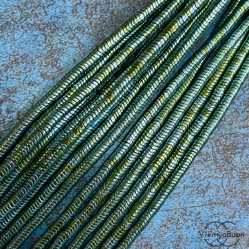 • Гематит, диск изогнутый волной,4х1 мм, цв. зеленый (нить, ок. 400 шт.)