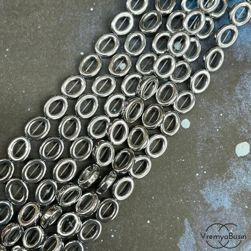 • Гематит, овальное кольцо 10х8х3 мм, цв. серебро (нить, ок. 38 шт.)