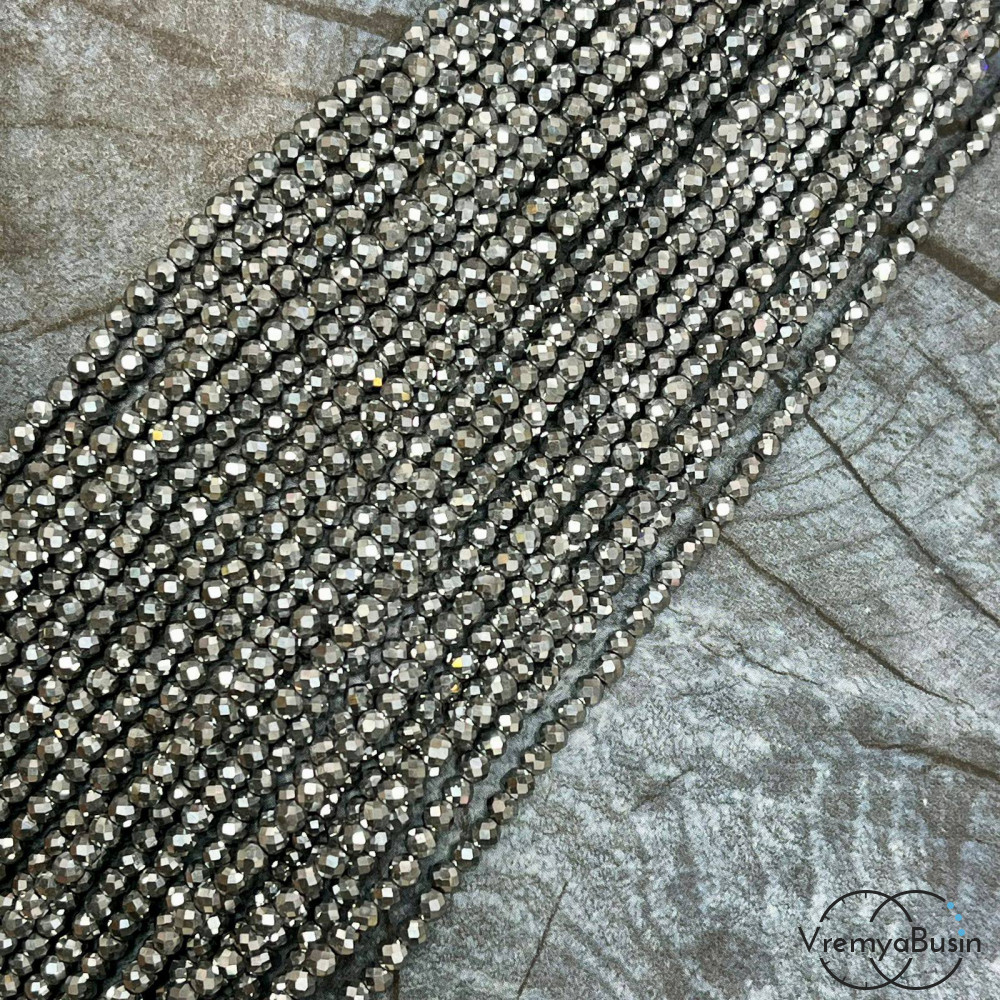 Гематит, шарик 3 мм с искристой мелкой огранкой, цв. серебро (нить, ок. 130 шт.)