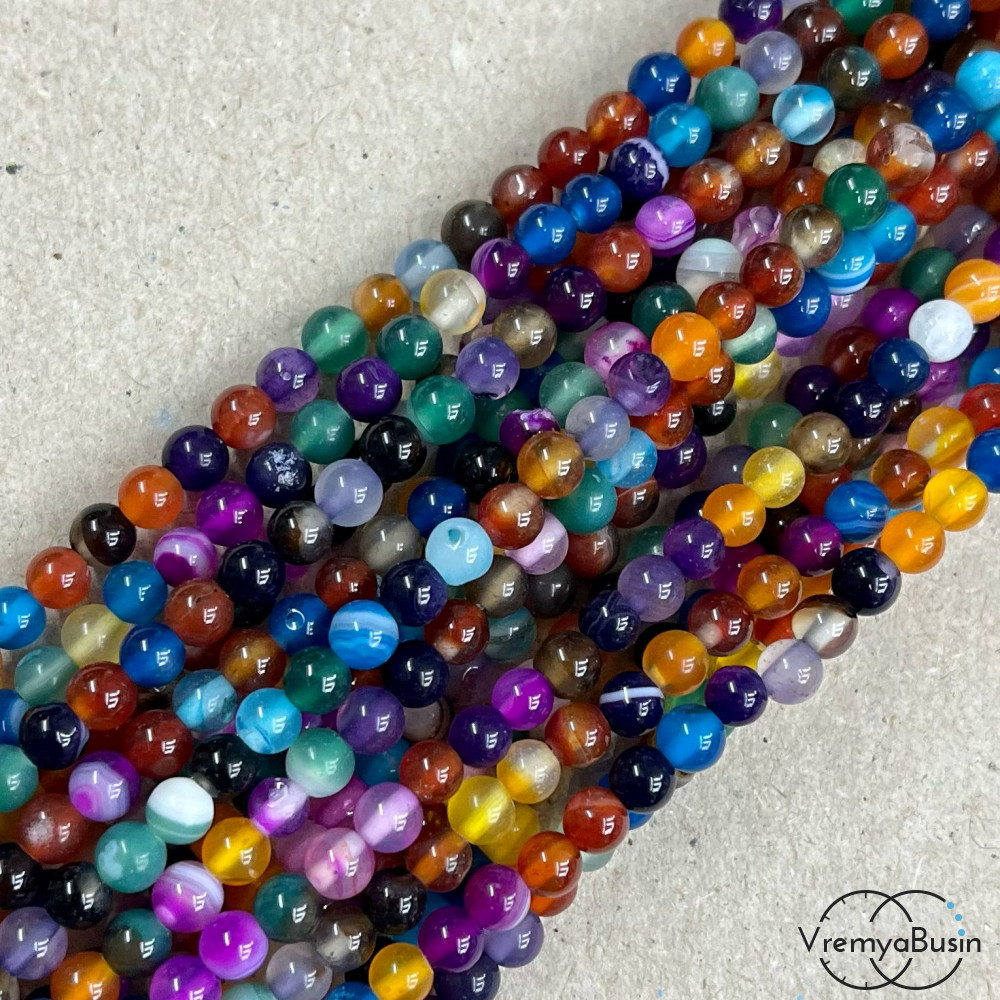Агат тонированный, гладкий шарик 4 мм, цв. микс (нить, ок. 90 шт.)