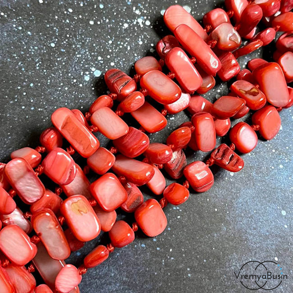 • Перламутр тонир., галтовка палочки ок. 10-30х8 мм, цв. красный (1/2 нити, ок. 60 см., ок.55 шт.)
