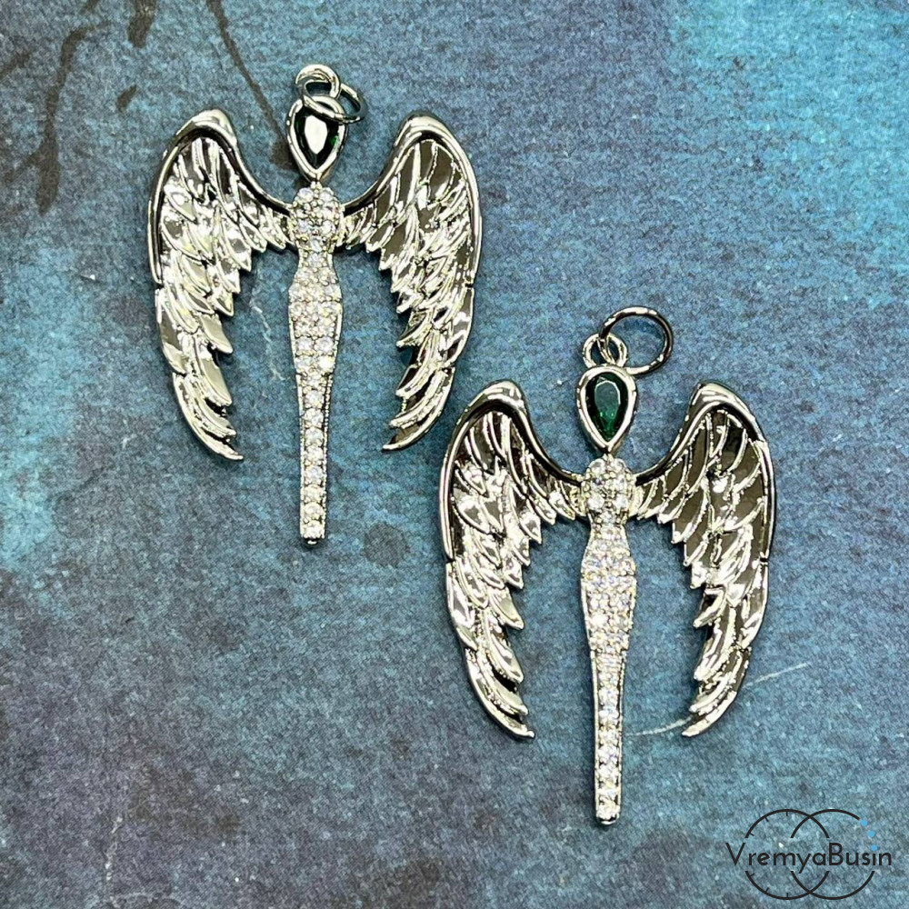 • Подвеска "Ангел", 22х32 мм, из латуни с родиевым покрытием и фианитами  (1 шт.)