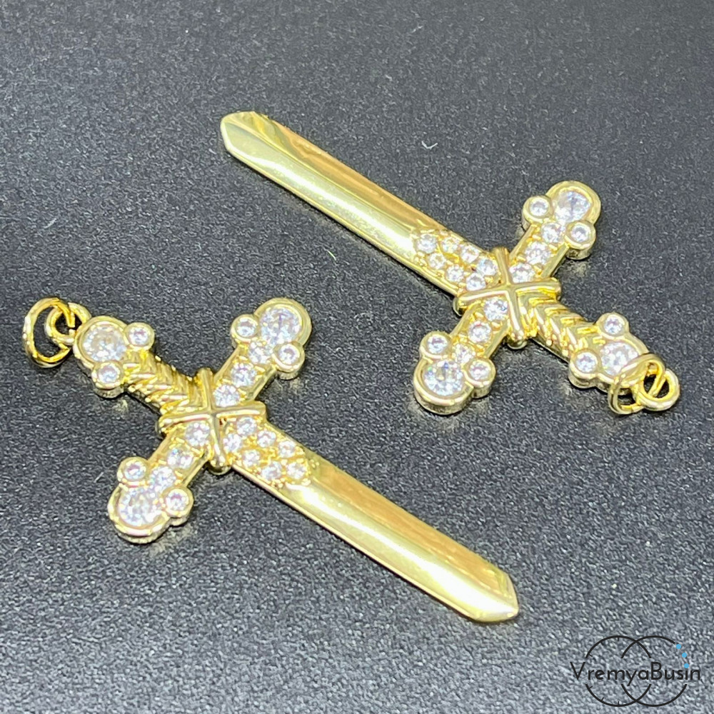 Подвеска из латуни с позолотой и фианитами, меч крест 20х40 мм (1 шт.)
