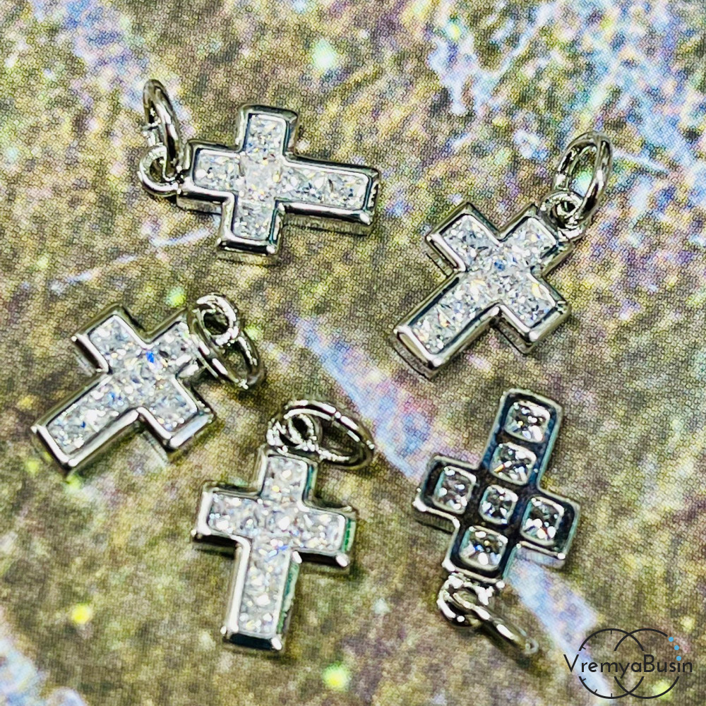 Подвеска из латуни с родиевым покрытием и фианитами, крестик 9х12 мм (1 шт.)