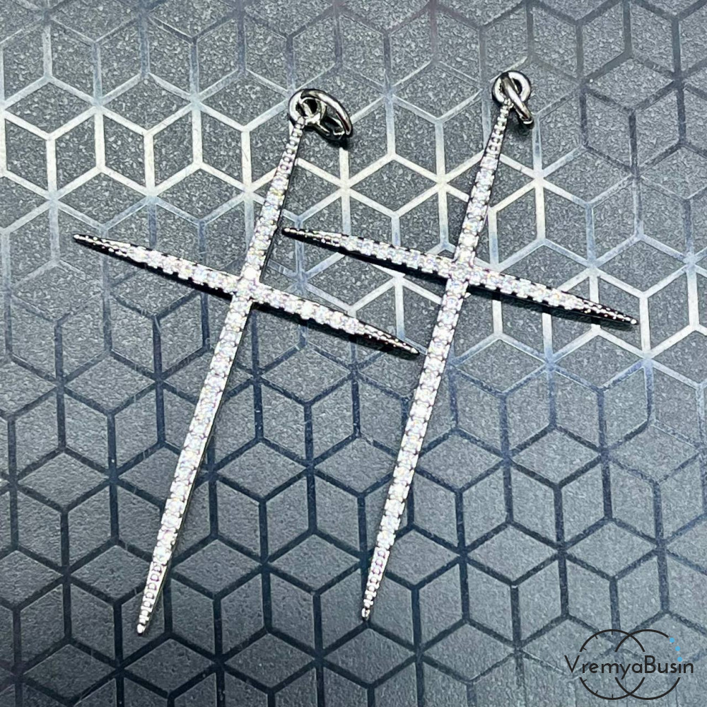 Подвеска "Крест", 44х28 мм, из латуни с родиевым покрытием и фианитами (1 шт.)