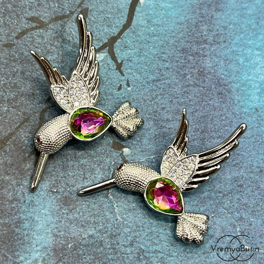 • Подвеска "Колибри", 24х28 мм, из латуни с родиевым покрытием и фианитами  (1 шт.)