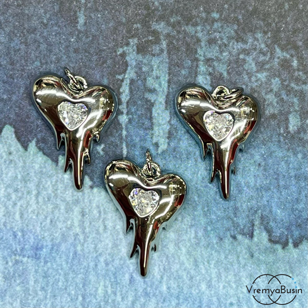 • Подвеска  "Расплавленное сердце", 20х16 мм, из латуни с родиевым покрытием и фианитами (1 шт.)