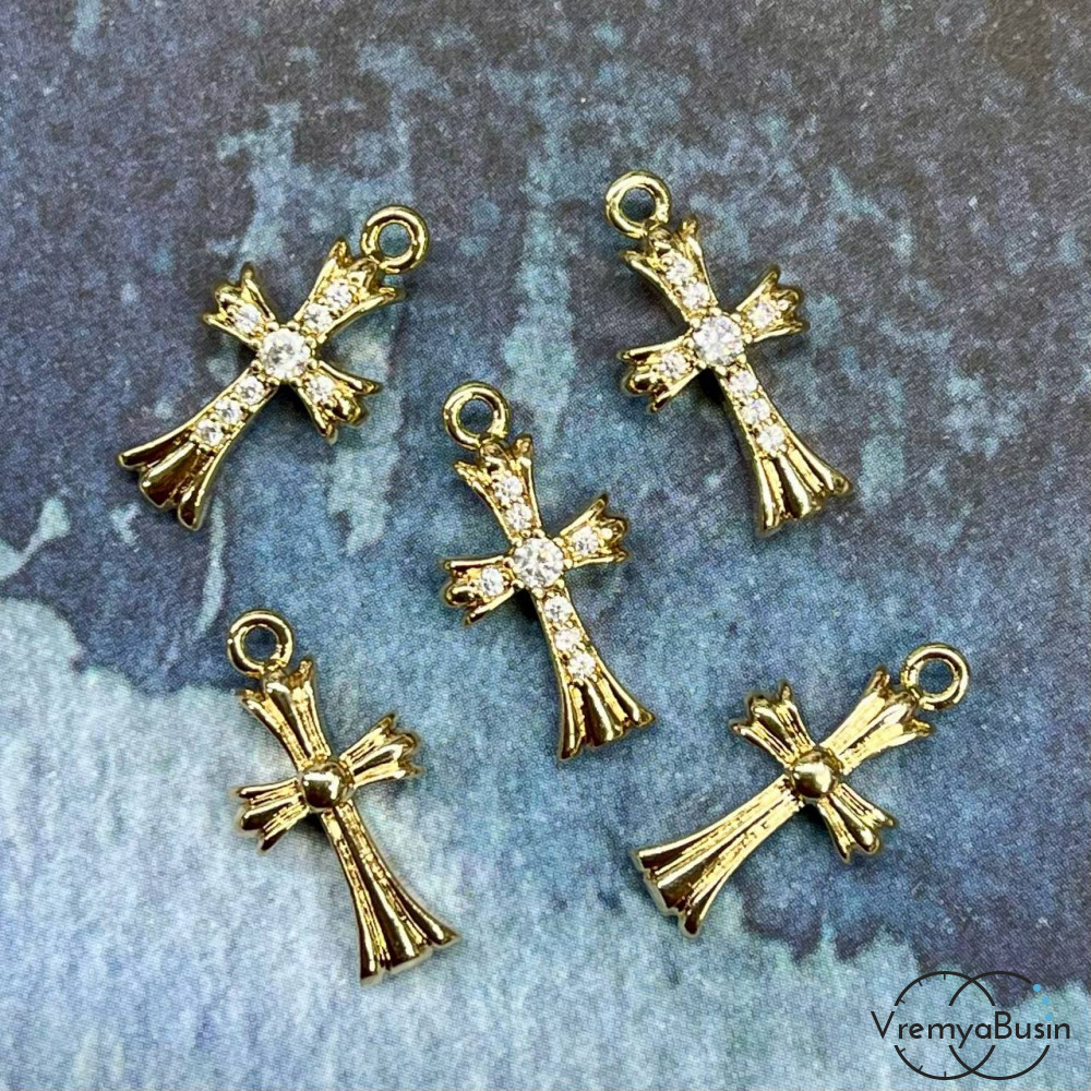Подвеска с фианитами "Крест", 18х9х5 мм, латунь с позолотой (1 шт.)