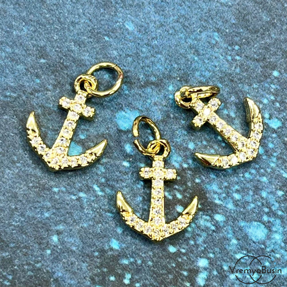 Подвеска с фианитами "Якорь", 10х13 мм, латунь с позолотой (1 шт.)