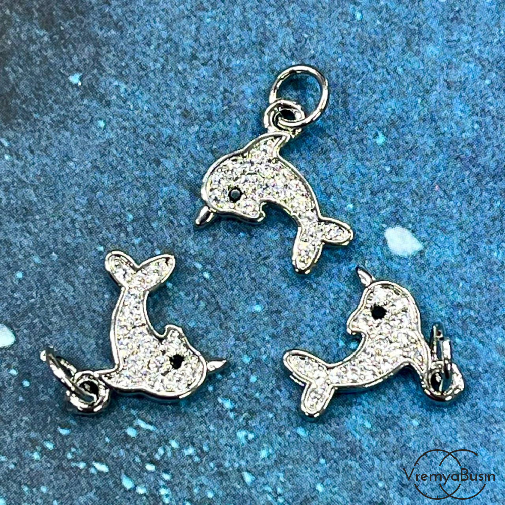 Подвеска с фианитами "Дельфин", 12х12 мм, латунь с родиевым покрытием (1 шт.)