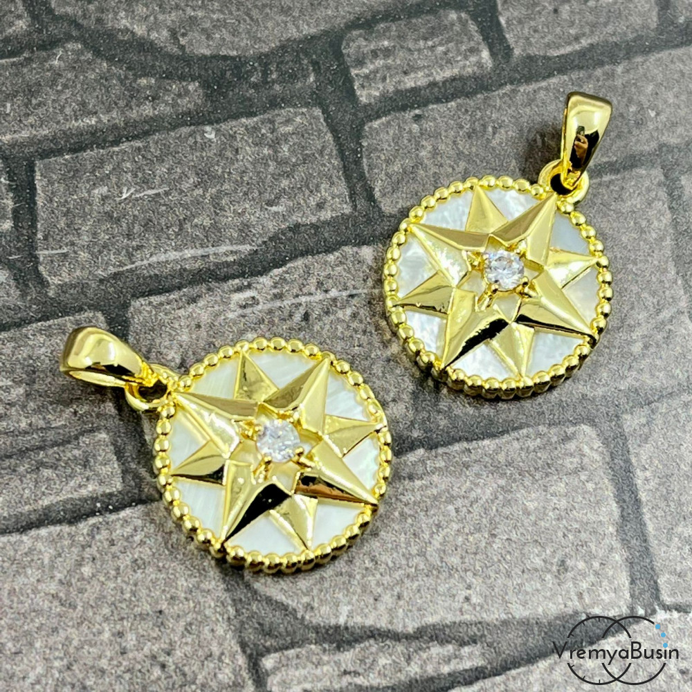 Подвеска с перламутром, диам. 15 мм, латунь с позолотой (1 шт.)