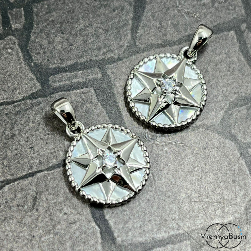 Подвеска с перламутром, диам. 15 мм, латунь с родиевым покрытием (1 шт.)