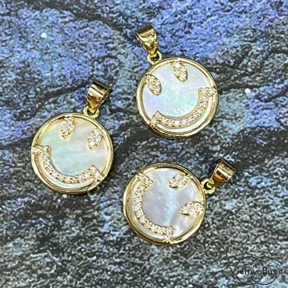 Подвеска с перламутром, смайлик 12 мм, латунь с позолотой (1 шт.)