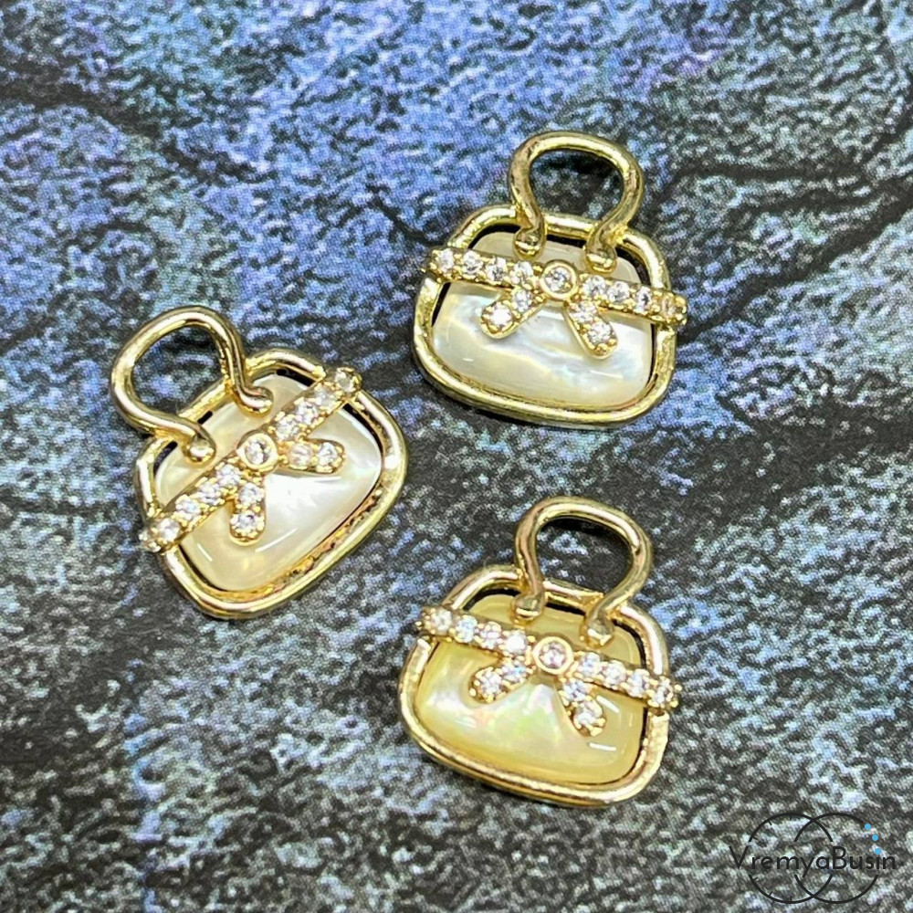 • Подвеска с перламутром "Сумочка", 12х14 мм, латунь с позолотой (1 шт.)