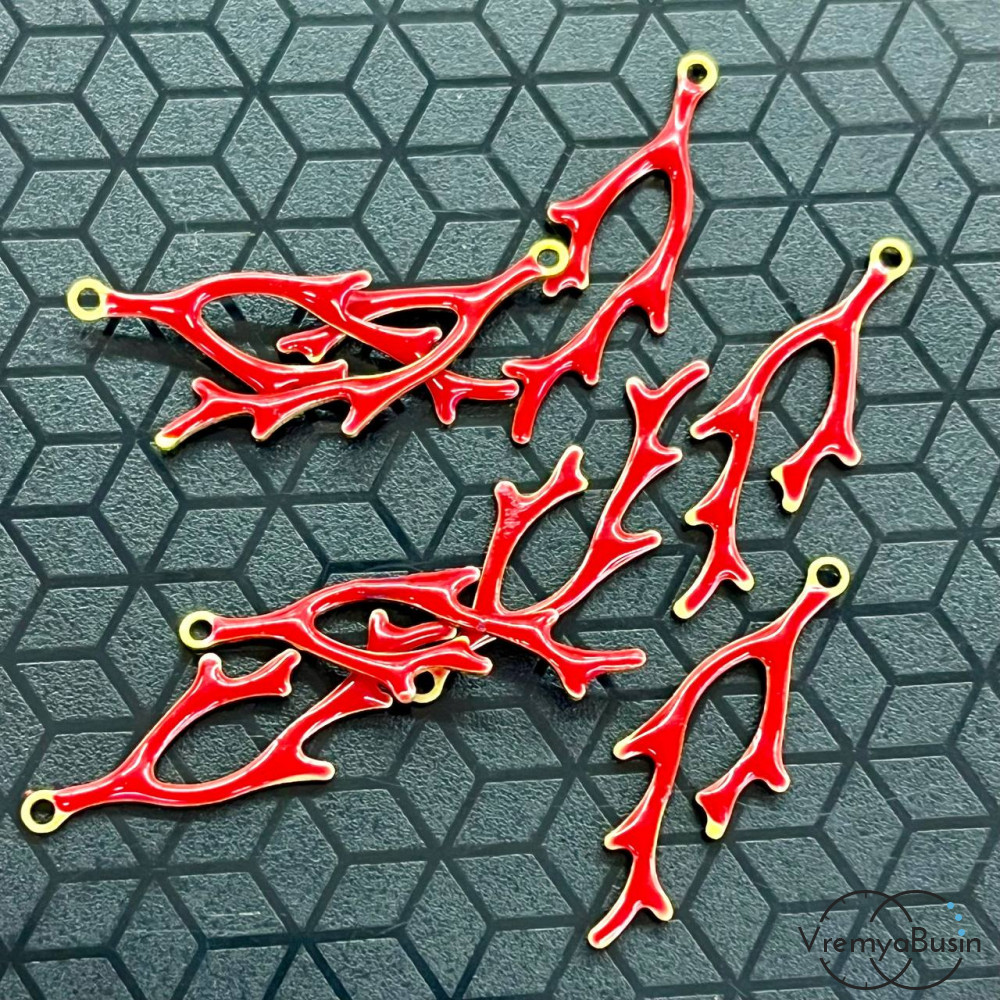 Подвеска с эмалью "Коралл", 9х24 мм, цв. красный, латунь с позолотой (1 шт.)