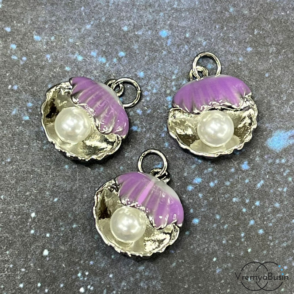Подвеска с эмалью "Ракушка с жемчужиной", 14х16 мм, латунь с родиевым покрытием (1 шт.)