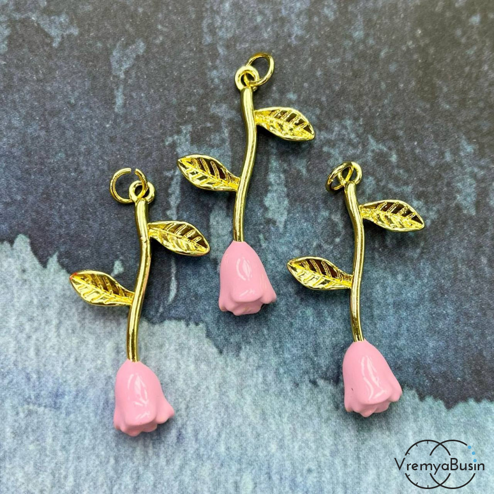 • Подвеска с эмалью "Роза", 35х20 мм,      латунь с позолотой, цв. розовый  (1 шт.)