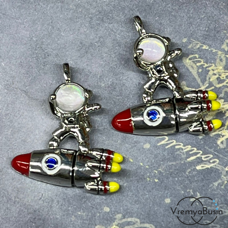 • Подвеска с эмалью, космонавт на ракете 22х28 мм, латунь с родиевым покрытием (1 шт.)