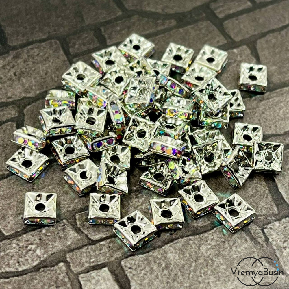 • Бусины-разделители квадратные, 6 мм, стекл. стразы цв. перламутр, металл цв. никель (1 шт.)