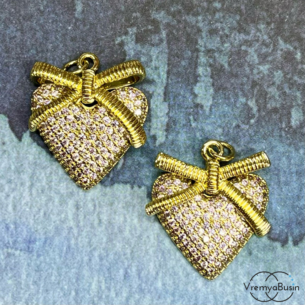 • Подвеска  с розовыми фианитами "Сердце с бантиком", 24х20 мм, из латуни  с позолотой (1 шт.)