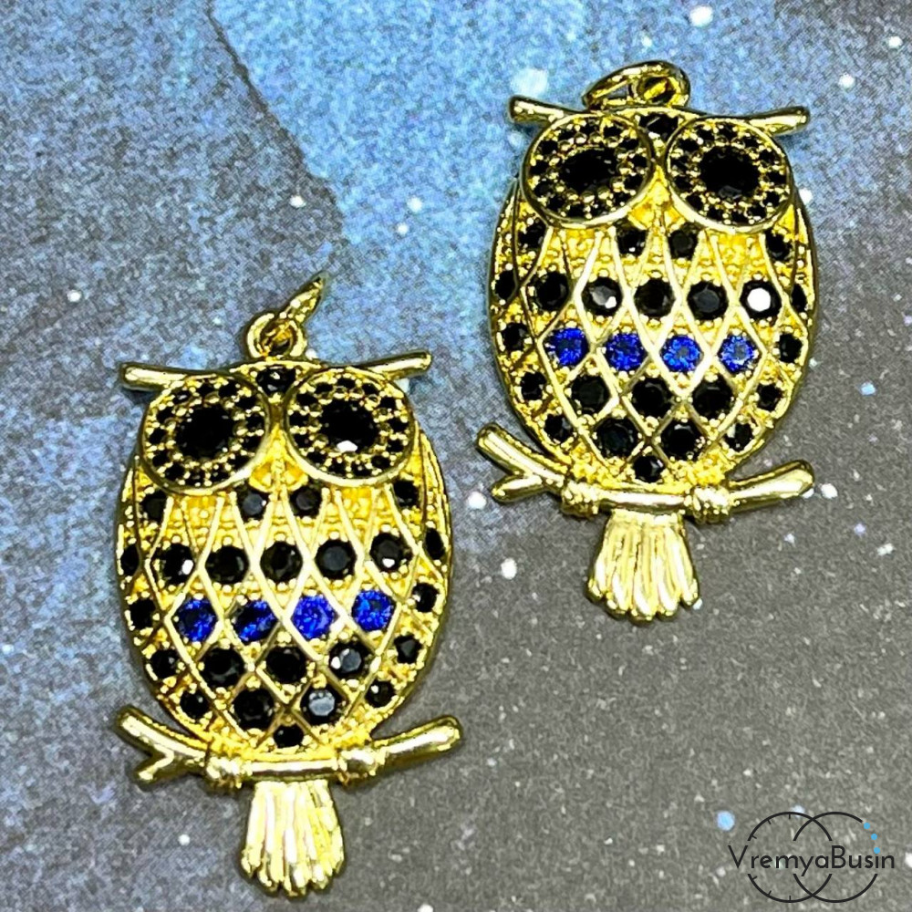 • Подвеска из латуни "Сова", 16х28 мм, с позолотой и синими фианитами (1 шт.)