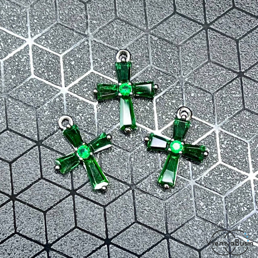 • Подвеска "Крестик", 12х16 мм, из латуни с родиевым покрытием и фианитами, цв. зеленый  (1 шт.)