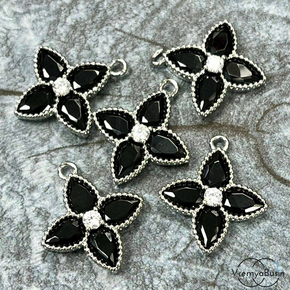 • Подвеска с фианитом, цветок 16х18 мм, латунь с родиевым покрытием, цв. черный   (1 шт.)