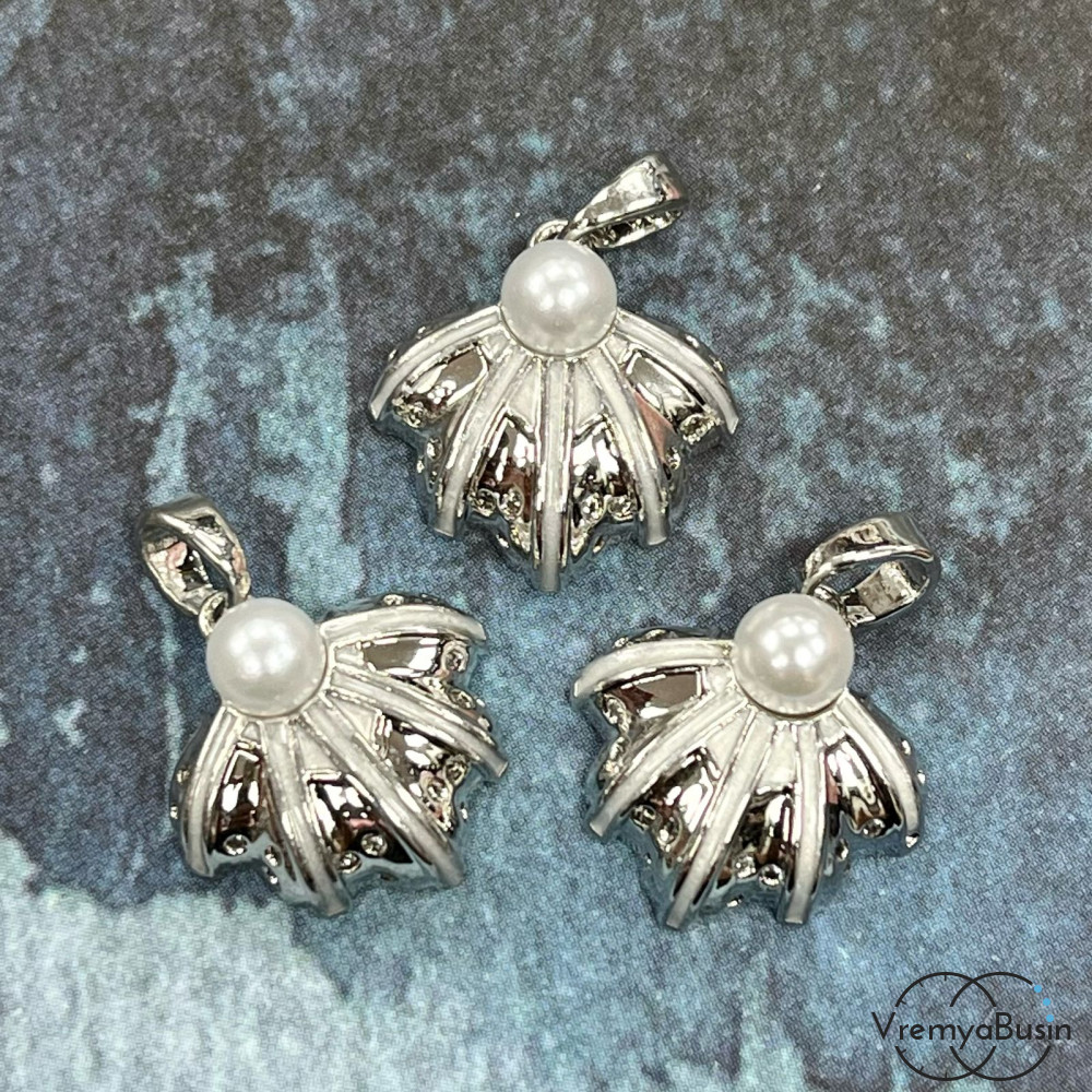 Подвеска "Ракушка" с эмалью и имит. жемчуга, 16х16 мм, латунь с родиевым покрытием (1 шт.)