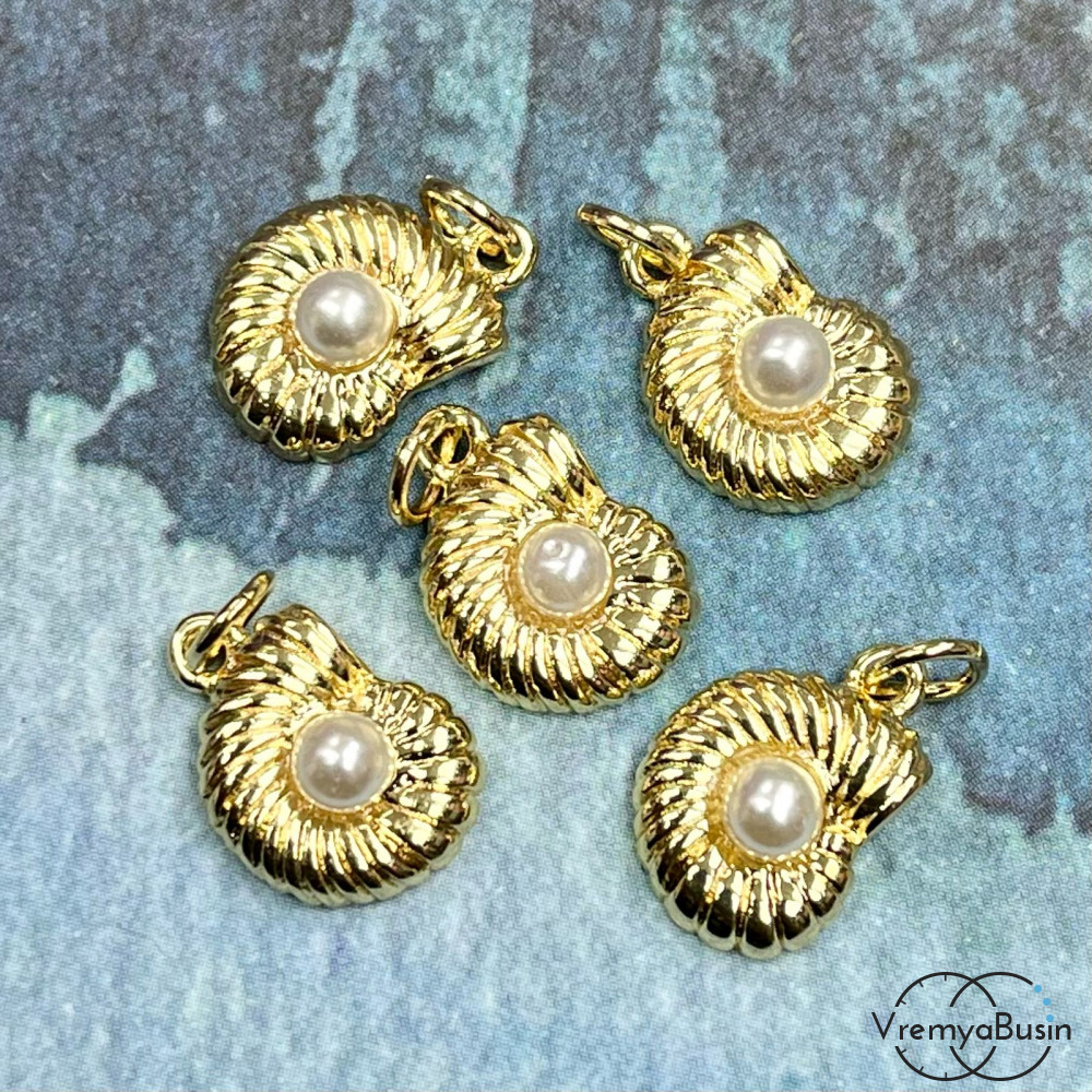 Подвеска "Ракушка" с имит. жемчуга, 10х14 мм, латунь с позолотой (1 шт.)