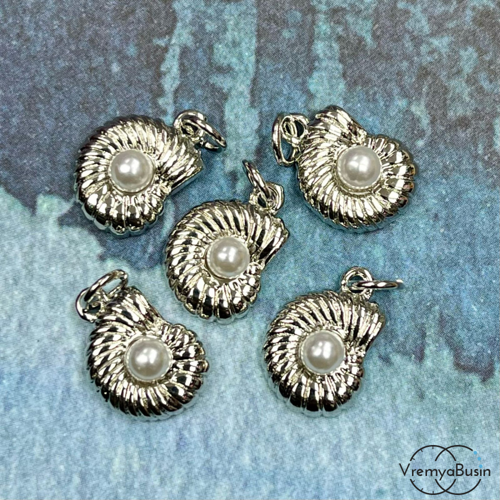 Подвеска "Ракушка" с имит. жемчуга, 10х14 мм, латунь с родиевым покрытием (1 шт.)