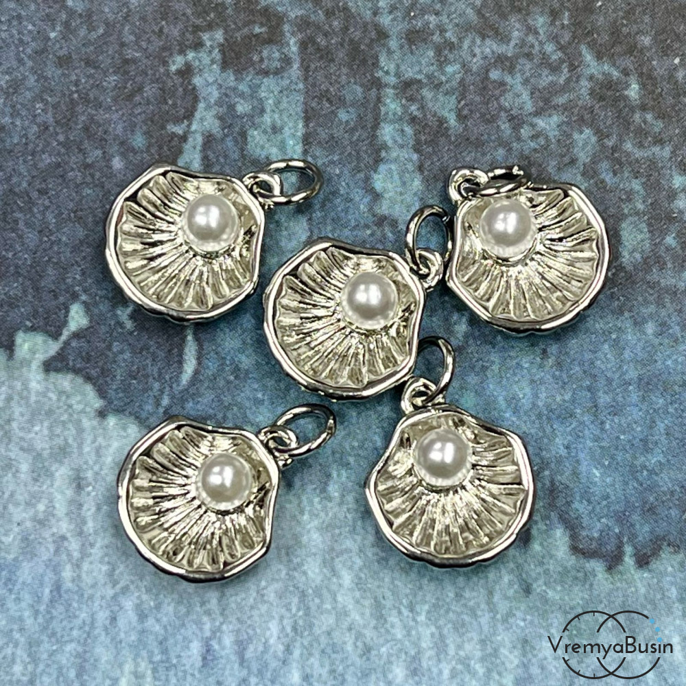 Подвеска "Ракушка" с имит. жемчуга, 11х13 мм, латунь с родиевым покрытием (1 шт.)