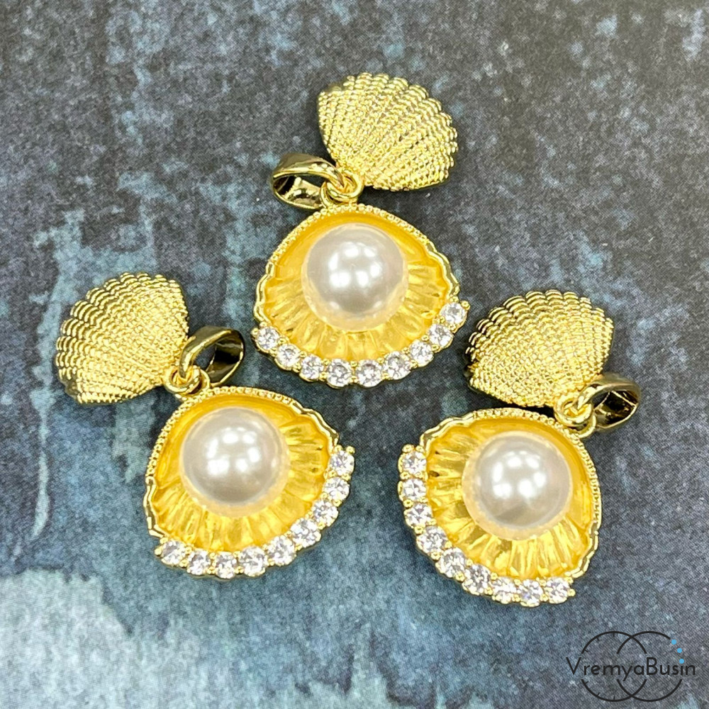 • Подвеска "Ракушка» с имит. жемчуга, 16х17 мм, латунь с позолотой (1 шт.)