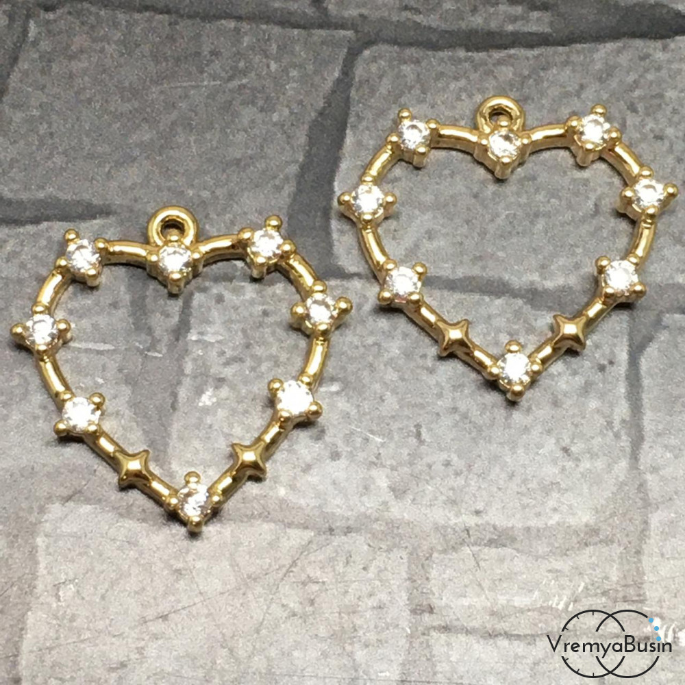 • Подвеска "Сердце" из латуни с позолотой и фианитами, 18х20 мм  (1 шт.)