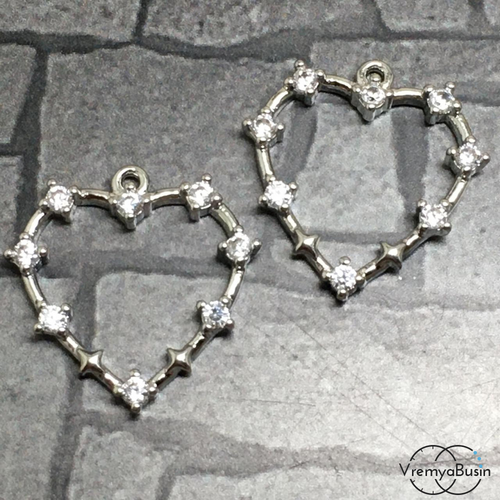 • Подвеска "Сердце" из латуни с родиевым покрытием и фианитами, 18х20 мм  (1 шт.)