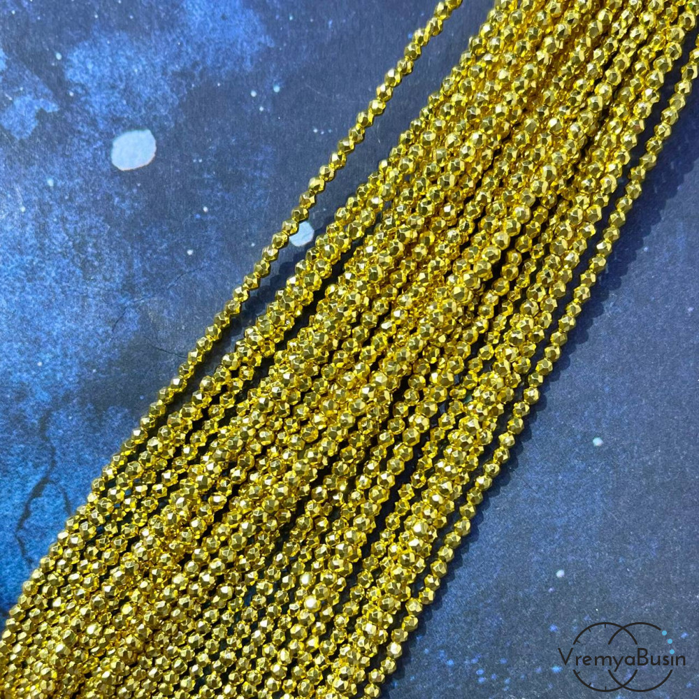 Бусины шарики из граненого стекла, имит. пирита, 2 мм (нить, ок. 40 см.)