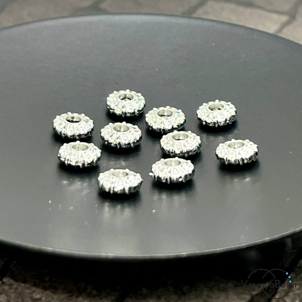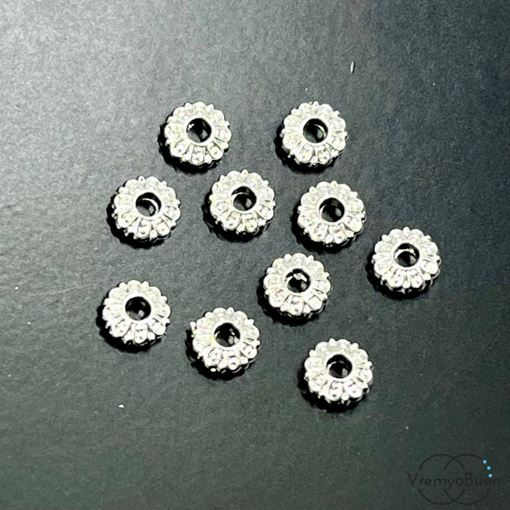 Бусины разделители, рондели с рисунком, 2х6 мм, латунь с родиевым покрытием (10 шт.)
