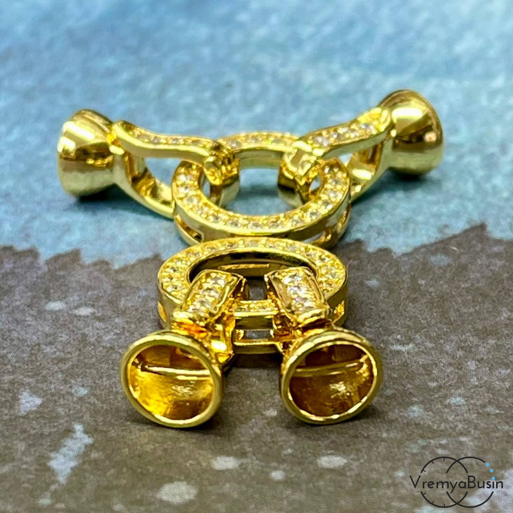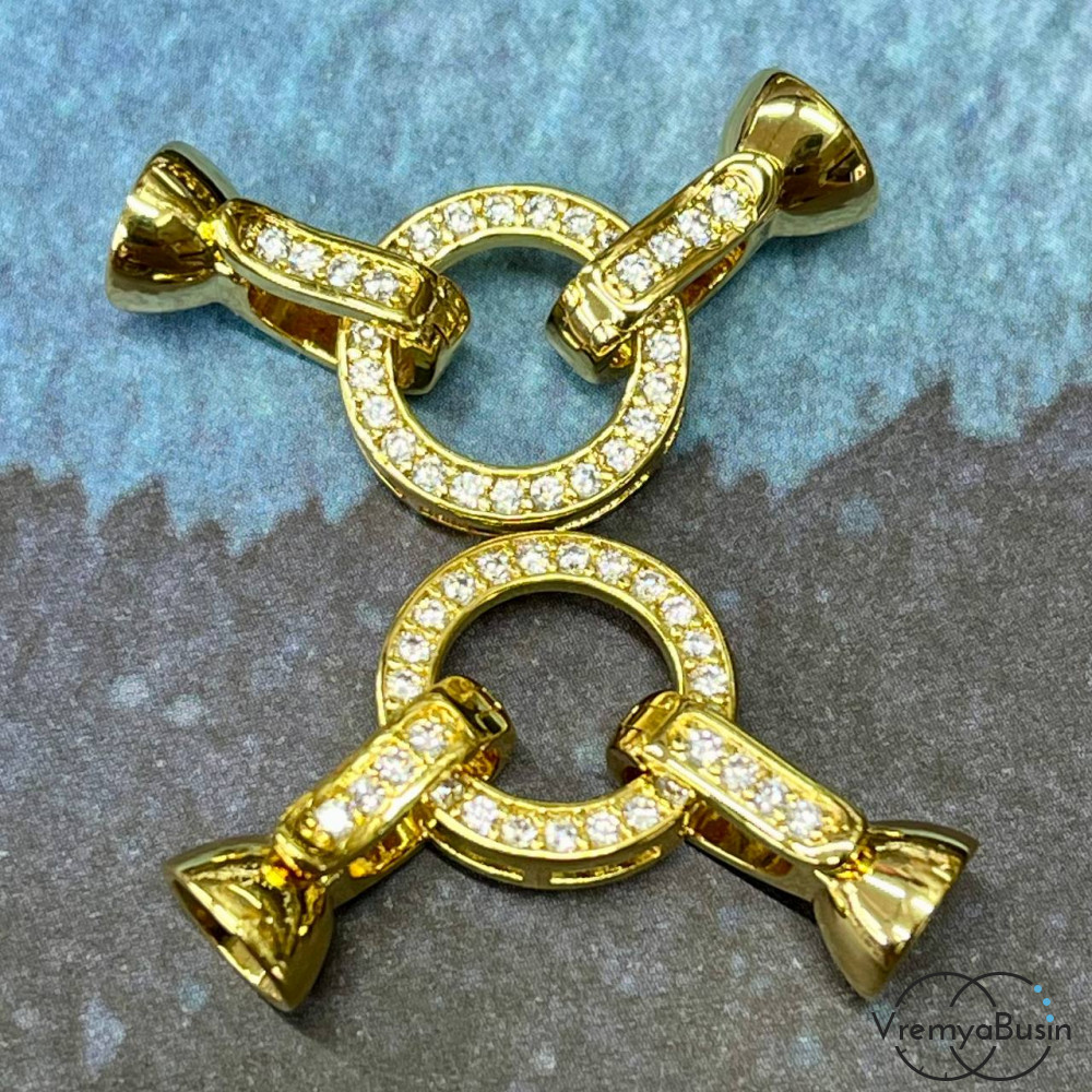 Замок для украшений, круг 14 мм, латунь с позолотой и фианитами (1 шт.)