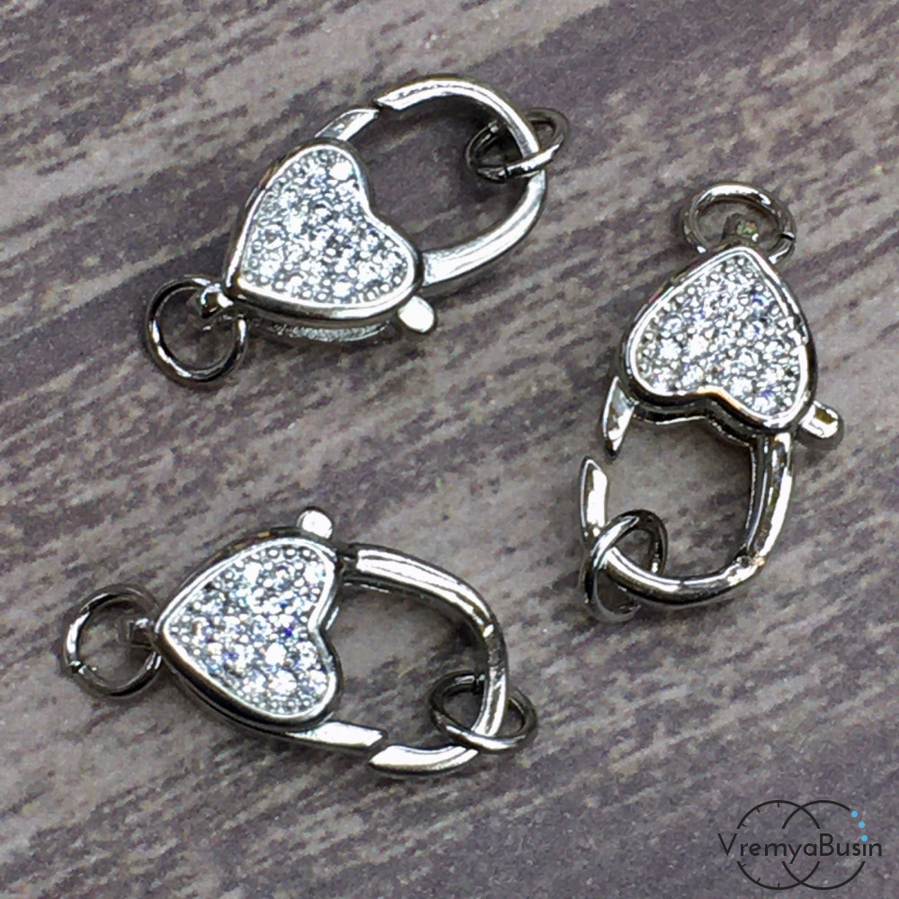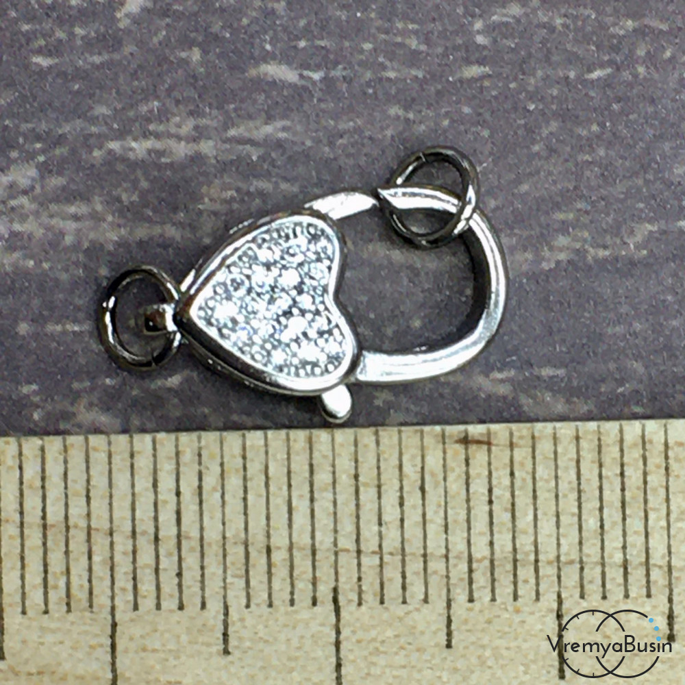 Замок-карабин для украшений, латунь с родиевым покрытием и фианитами (1 шт.)