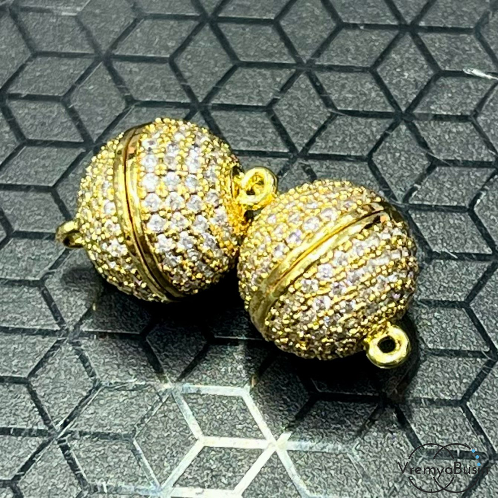 Замок магнитный, шарик 12 мм, латунь с позолотой и фианитами (1 шт.)