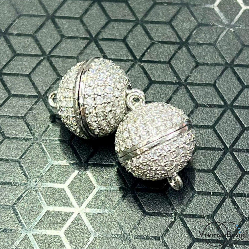 Замок магнитный, шарик 12 мм, латунь с родиевым покрытием и фианитами (1 шт.)