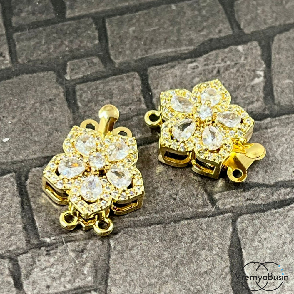 Замок на 2 нити, 15х20 мм, латунь с позолотой и фианитами (1 шт.)