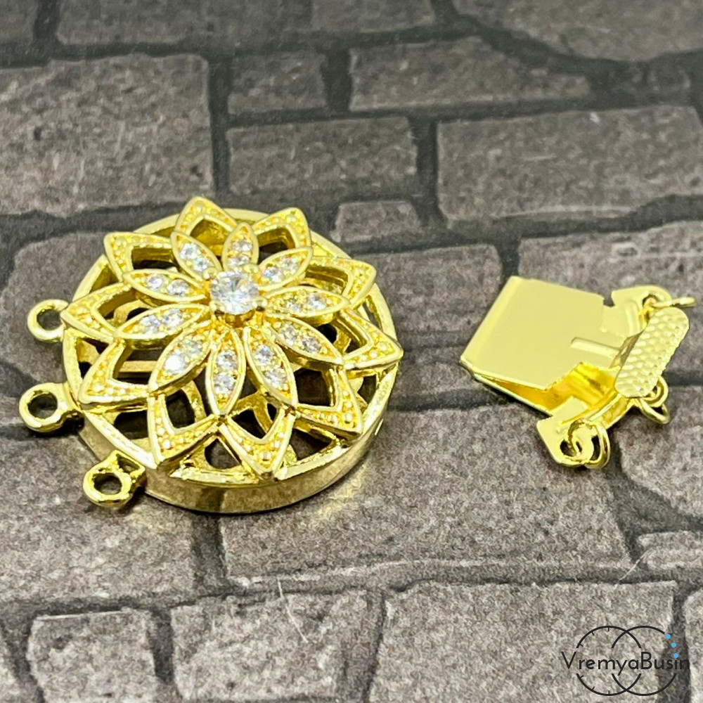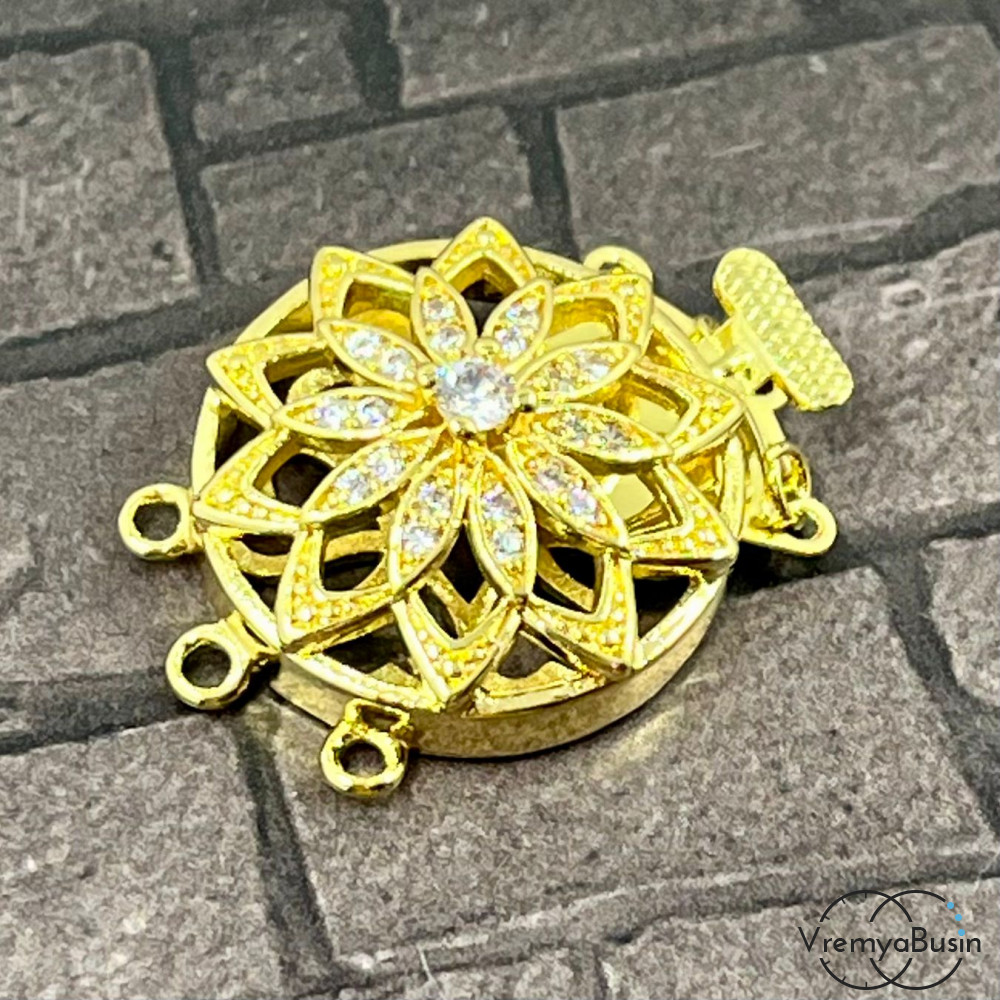 Замок на 3 нити, 22х28 мм, латунь с позолотой и фианитами (1 шт.)