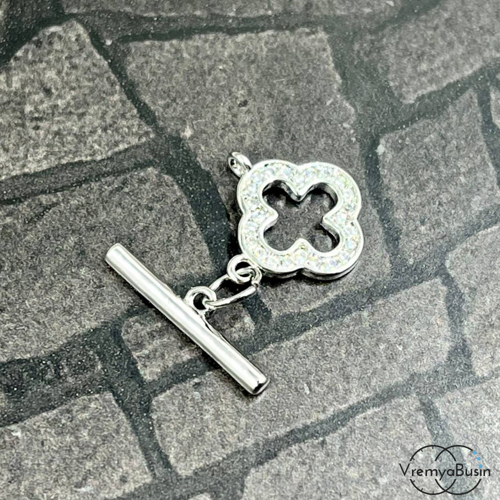 • Замок тоггл с фианитами, клевер 10 мм, на 2 нити, латунь с родиевым покрытием (1 шт.)