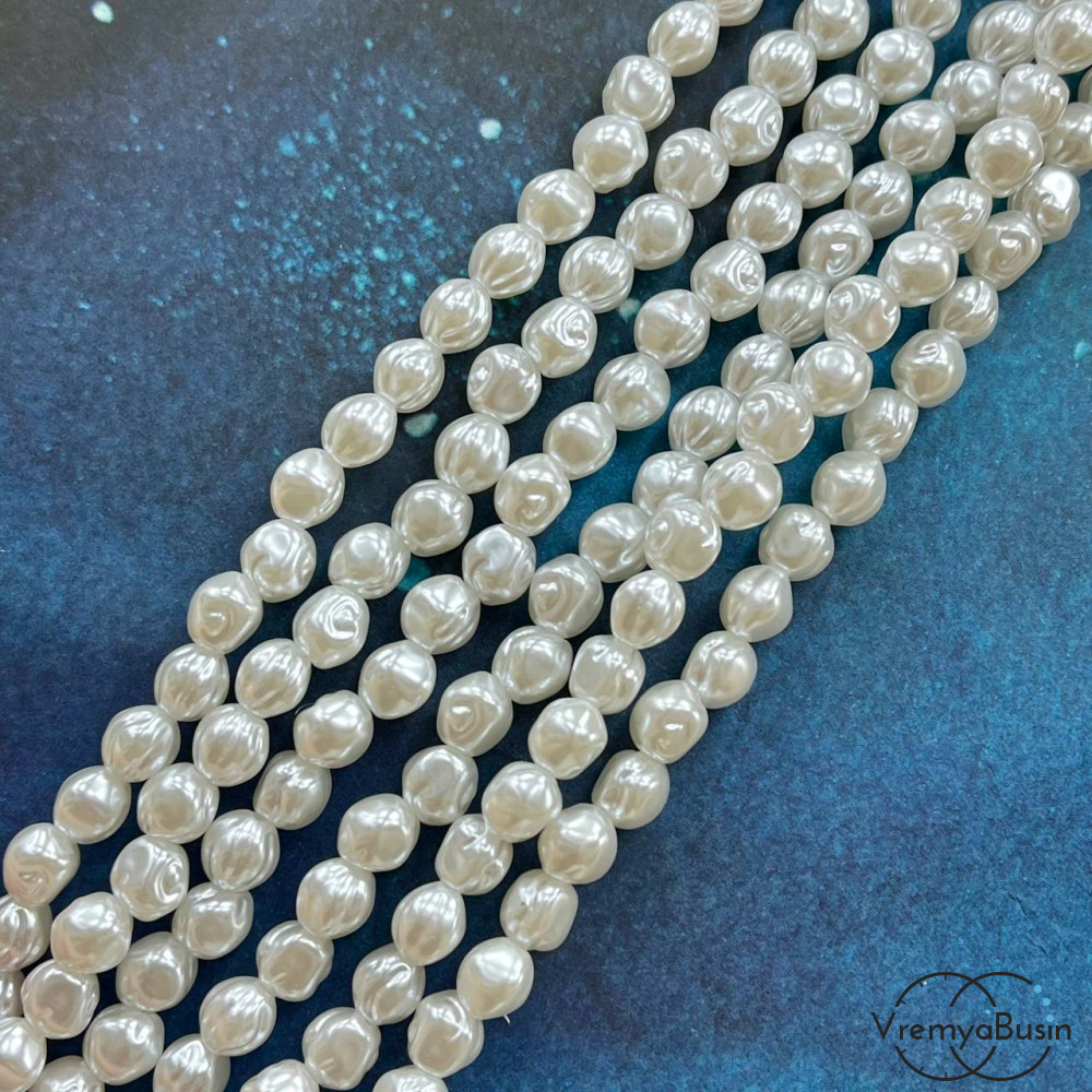 Жемчуг акриловый белый, шарик рифленый 7х8 мм (нить, ок. 50 шт.)